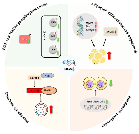 Kirsten rat sarcoma 2 viral oncogene homolog (Kras) is a proto-oncogene that encodes a small GTPase transductor protein called KRAS, which has previously been found to promote cytokine secretion, cell survival, and chemotaxis [,]. It is also a signal transducer protein that plays important regulatory roles in various cellular signaling pathways. Previous studies have indicated that KRAS mediates the reprogramming of glutamine metabolism [] and controls the Hedgehog [], phosphatidylinositol 3 kinase (PI3K) [], CTEN [], RAL-GEF [], and Nrf2 [] pathways, thereby acting as a key regulatory factor and a therapeutic target for cancers [,]. In addition, stimulation by appropriate ligands induces a signaling cascade, linking membrane-associated tyrosine kinase receptors to MAPK proteins, that involves the Ras protein [], which participates in the regulation of lipogenesis. KRAS belongs to the Ras superfamily, which is a group of guanosine triphosphate (GTP)-binding proteins []; thus, KRAS may affect preadipocyte proliferation and differentiation by regulating MAPK. However, few studies have clarified the key roles of KRAS in preadipocyte differentiation and lipid accumulation.