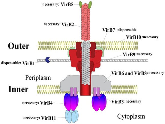 Other components include VirB1 and VirB12. VirB1 does not bind to any other VirB protein and exist alone in the periplasm; it is the first product of the VirB operon; can cleave the β-1,4-glycosidic bond between MurNAc (N-acetylmuramic acid) and GlcNAc (N-acetylglucosamine) [24]. Its n-terminus is a lytic transglycosylase, which may facilitate T4SS assembly by local destruction of peptidoglycans [15]. The c-terminal protein VirB1* can be cleaved from VirB1 and secreted outside bacterial cells, interacting with the T-pilus subunit to promote T-pilus assembly [30]. The exact location of VirB12 is still unclear; it is only confirmed that it is a cell surface protein that induces antibody response during animal infection [31,32].
