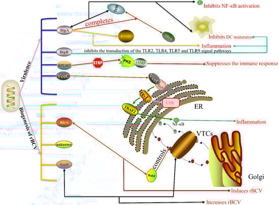 VirB T4SS affects cellular pathways. The role of T4SS effectors can be divided into two aspects: one is the influence through virulence, and the other is the influence on the formation of rBCV. In terms of virulence, the effector BtpA interacts with MAL and competes with it for TRL4, thus inhibiting the activation of NF-κB and the maturation of DC; effector BtpB inhibits DC maturation and induces inflammation by inhibiting transduction of the TLR2, TLR4, TLR5 and TLR9 signal pathways; effector BPE005 suppresses the immune response by inhabiting the combination of PKE and cAMP; effector VceC causes inflammation by activating UPR. In the biogenesis of rBCV, effector RicA reduces the Rab2 content in eBCV by interacting with it, thus reducing the formation of rBCV; effector BspB targets VTCs and interacts with COG to promote the formation of RBCV.