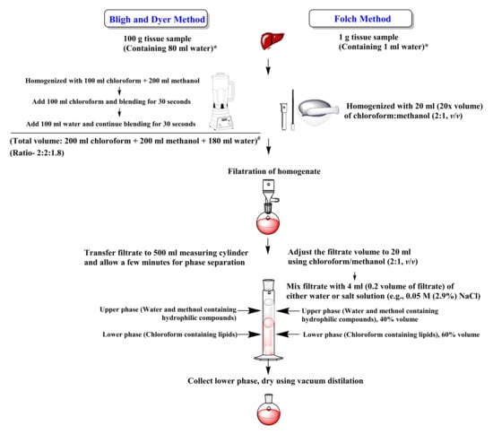 The Folch method [7] and Bligh and Dyer method [8], published in 1957 and 1959, respectively, are considered gold standards for the extraction of lipids [73]. Though these methods were originally developed to extract lipids from animal tissues, the high efficiency of the chloroform/methanol in extracting major lipid classes, these methods are widely followed to extract lipids from a wide range of plants and animals (fluids and tissues) samples. The Folch method is generally preferred to extract lipids from solid tissue, whereas the Bligh and Dyer method is considered advantageous for biological fluids [3].