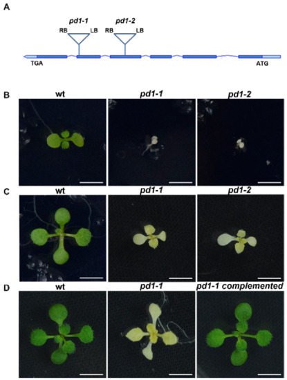2.1. pd1 Mutant Shows the Albino and Seedling-Lethal Phenotypes