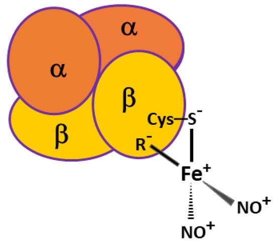 Hemoglobin (Hb) was the object of this study, since this protein is the main target of peroxynitrite action in RBC []. In addition, Hb is one of the proteins that DNICs bind to [,]. Figure 1 shows a schematic image of DNIC bound with tetrameric erythrocytic Hb. One of the ligands of this complex is Cys93 residue of the Hb β-subunit, the other may be an anionic group of amino acid residue spatially close to Cys93. This amino acid residue is denoted as R−.