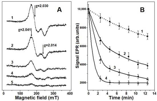 Destruction of metHb-bound dinitrosyl iron complexes (Hb-DNICs) with peroxynitrite (ONOO−). The reaction mixture contained 0.2 M Na, K-phosphate buffer (pH 7.2) and 0.4 mM Hb-DNICs (Hb concentration). (A)—typical electron paramagnetic resonance (EPR) spectra recorded 4.5 min after adding various peroxynitrite concentrations to the reaction mixture: 1—Hb-DNICs without peroxynitrite, 2—Hb-DNICs + 1.25 mM (1:3.2), 3—Hb-DNICs + 2.5 mM ONOO− (1:6.25), 4—Hb-DNICs + 4.8 mM ONOO− (1:12), 5—Hb-DNICs + 5.8 mM ONOO− (1:14.5), the molar ratio of Hb or Hb-DNICs to ONOO− is shown in parenthesis. (B)—kinetics of Hb-DNICs degradation with the action of various ONOO− concentrations (results of five experiments).