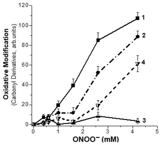 The formation of carbonyl derivatives is one of the main oxidative modifications of biomolecules, i.e., proteins. In our experiments, DNICs had a pronounced inhibitory effect on metHb carbonylation in the presence of peroxynitrite. They protected Hb in a wide range of ONOO− concentrations (0.38–4.20 mM) (Figure 3). With metHb:ONOO ratio of 1:6.5, the amount of Hb-DNICs carbonyl derivatives was 60% lower than in a control sample without DNICs (Figure 3, curves 1 and 2).