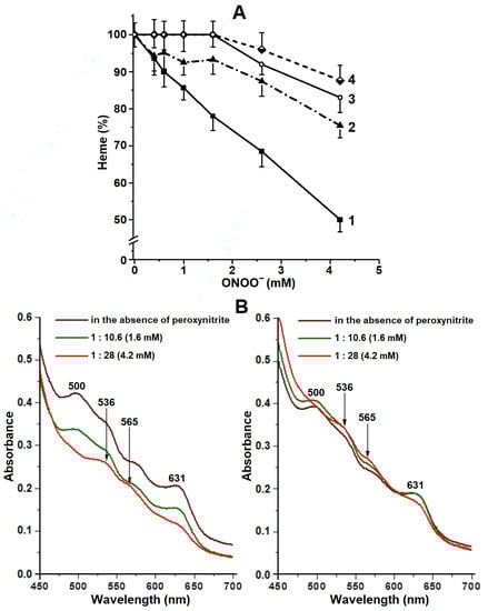 (A)—destruction of the heme group of methemoglobin under the impact of peroxynitrite. Curves 1 and 3—metHb, curves 2 and 4—Hb-DNICs, curves 3 and 4—with diethylenetriaminepentaacetic acid (DTPA). The composition of the reaction medium, including peroxynitrite concentration, is the same as in the legend to Figure 3. (B)—Changes in the state of the heme group in Hb-DNICs during the oxidation by peroxynitrite. Left—metHb, right—Hb-DNICs.