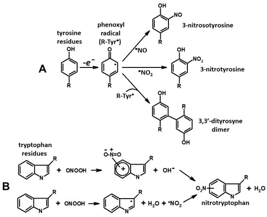 - Alvarez, B.; Rubbo, H.; Kirk, M.; Barnes, S.; Freeman, B.A.; Radi, R. Peroxynitrite-dependent tryptophan nitration. Chem. Res. Toxicol. 1996, 9, 390–396. [Google Scholar] [CrossRef] [PubMed]