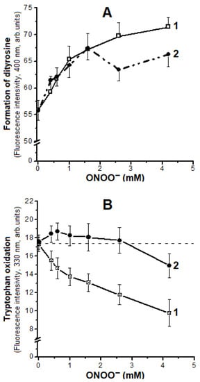 Changes in fluorescence during the formation of dityrosines (A), and during the oxidation of tryptophan residues (B) under peroxynitrite action. Curve 1—metHb, 2—Hb-DNICs. The composition of the reaction medium including peroxynitrite concentration is the same as in the legend to Figure 3.