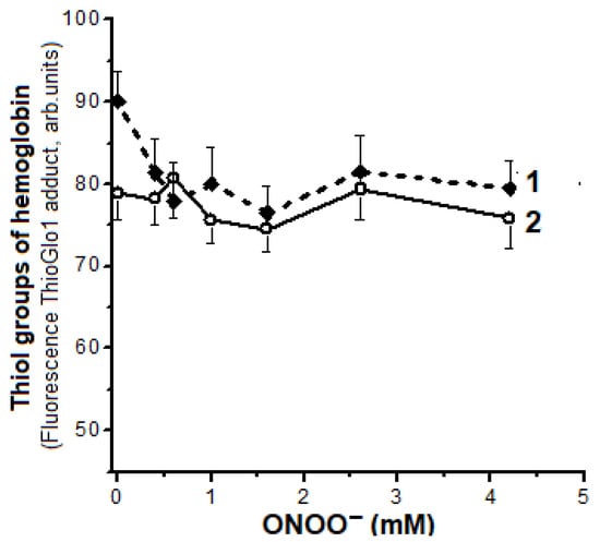 In our experiments the interaction of ONOO− with metHb resulted in slight oxidation of SH- groups (reactive cysteines Cys93β) (Figure 7). A ~10 % decrease in fluorescence intensity of the thiol adduct with ThioGlo1 was observed with a molar ratio of metHb:ONOO− = 1:4 (0.6 mM ONOO−) (Figure 7, curve 1). Further increase in ONOO− concentration did not lead to the increased oxidation of metHb SH-groups.