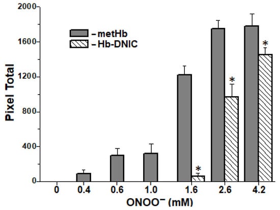 Low-molecular-weight and protein-bound DNICs are destroyed by various oxidizing agents (peroxides and superoxide anion radicals) [,,,]. Therefore, we investigated the destruction of metHb-bound DNICs (Hb-DNICs) under various ONOO− concentrations.