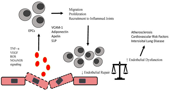 Activation of ROS, NO/eNOS signaling, TNF, and other factors as adipokines, sphingosine 1 phosphate modify proliferation, recruitment and migratory properties of EPCs, which further interfere with endothelial repair/damage equilibrium and induce acceleration of atherosclerosis and other conidiations related to RA.