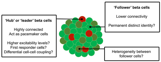 Beta cells display a heterogenous response to glucose including differences in excitability levels. A subpopulation of “hub” cells has been described that account for up to 10% of total beta cells. These “hub” cells, as opposed to “follower” beta cells, exert an acute control over islet response to high glucose and may therefore determine a key component of beta cell connectivity by coordinating the calcium response across the islet, acting as “pacemakers”.