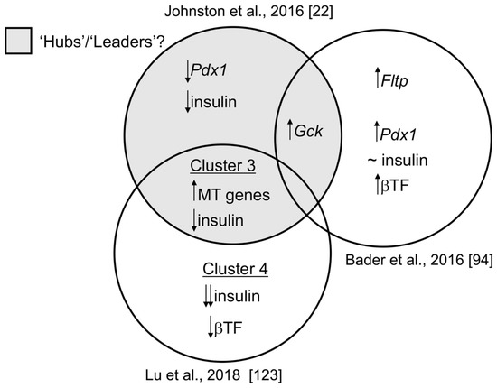 Hub cells were also observed in mouse islets as well as in the living fish embryo, with the former becoming revascularized and innervated when engrafted into the anterior chamber of the eye [116]. Similar to what was observed in mouse islets in vitro, photo-ablation of “leader” cells in the zebrafish led to loss of a coordinated calcium response [116], confirming their possible role as pacemakers. Moreover, these new findings suggest that beta cell “hubbiness” is an intrinsic property of this population and not simply reflective of the localisation of these cells within the islet (e.g., their proximity to blood vessels, nerve termini, etc.). Others [117] have demonstrated that optogenetic activation of subpopulations leads to the activation of Ca2+ waves, consistent with the above model, though the degree to which different sub-groups of “hubs”, “leaders” and “first responders” overlap is a matter of contention. Importantly, the means through which “hubs” transmit Ca2+ waves across the islet remains unclear, with both a direct mechanism involving cell-cell contacts and gap junctions [118] and the involvement of other cell types such as delta cells [119] both possible. Indeed, whilst theoretical considerations have prompted some authors to query the role of gap junctions [120], the grounds for these concerns can be questioned [121], and modelling by others [122] is consistent with these cells playing a coordinating role though gap junctions. Certain characteristics of this “hub/leader” subpopulation are nevertheless still unclear, including their complete transcriptomic (and proteomic) signature. Nevertheless, analysis of published RNA-seq data has shown higher Gck and lower Pdx1 and insulin expression, and revealed a notable enrichment in genes involved in glucose oxidation [116]. We attempt, in Figure 2, to ascribe known differences in gene expression in the mouse to different beta cell subclusters [22,94,123]. Whether imprinted gene expression differs between beta cell populations (e.g., hubs and followers) is yet to be established and is an active area of research.