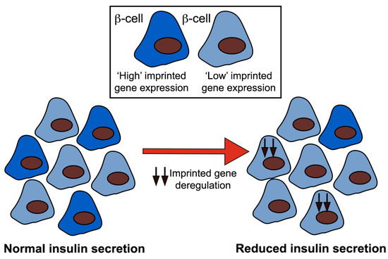 A proposed model for beta cell heterogeneity in terms of imprinted gene expression. Deregulation of imprinted gene expression by environmental factors (i.e., diet) would, in this scenario, reduce beta cell heterogeneity and therefore insulin secretion. Black arrows represent deregulation of imprinted gene expression.