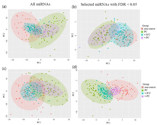 Principal component analysis by comparing case-control and validation samples based on different sets of miRNAs. Red, green, blue, and purple dots represent control, case, validation-control, and validation-case samples, respectively. (a,b) 63 pancreatic cancer (PC) cases and 29 non-cancer controls and (c,d) 63 PC cases and 63 non-PC controls. (a,c) All miRNAs and (b,d) selected miRNAs with false discovery rate <0.05. PC, pancreatic cancer; v-PC, validated-pancreatic cancer; FDR, false discovery rate; v-ICC, validated-intrahepatic cholangiocarcinoma.