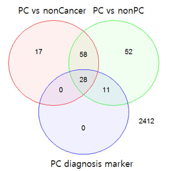 Venn diagram of the differentially expressed miRNAs and 39 selected diagnostic markers. The top 39 miRNAs included 28 miRNAs that were differentially expressed between pancreatic cancer (PC) samples and non-cancer samples (false discovery rate (FDR) < 0.05) and 11 miRNAs that were differentially expressed only between the PC and non-PC samples (FDR < 0.05).