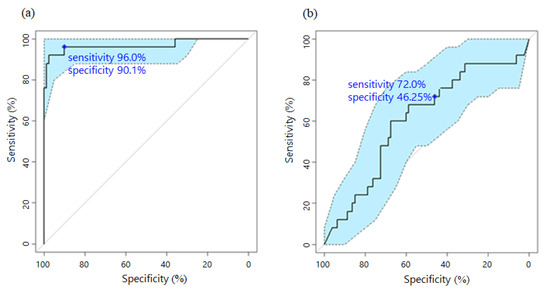 Receiver-operating characteristic (ROC) curve for pancreatic cancer (PC) diagnosis based on the proposed model and CA19-9. For validation, 25 PC samples and 81 intrahepatic cholangiocarcinoma samples were used to apply the (a) proposed model and (b) CA19-9 diagnosis. The confidence band of the ROC curve is indicated in light blue. The blue point represents the sensitivity and specificity based on the predefined threshold in each plot.