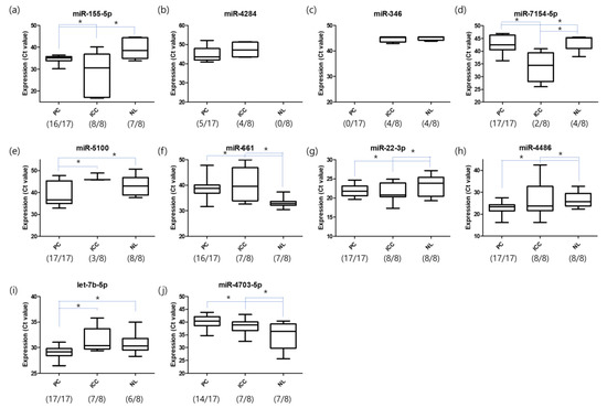 miRNA expression determined using quantitative reverse transcription (qRT-PCR). Differential expression levels of miRNAs selected from the chip data were further analyzed using qRT-PCR to confirm the expression levels in the serum samples of patients with PC (n = 17), patients with ICC (n = 8), and healthy individuals (n = 8). The expression levels of (a) miR-155-5p, (b) miR-4284, (c) let-346, (d) miR-7154-5p, (e) miR-5100, (f) miR-661, (g) miR-22-3p, (h) miR-4486, (i) let-7b-5p, and (j) miR-4703-5p were analyzed using primers for mature miRNAs (* p-value < 0.05). The number of samples with expression is indicated as (Number Expression/Number Total). PC, pancreatic cancer; ICC, intrahepatic cholangiocarcinoma; NL, normal or non-cancer.