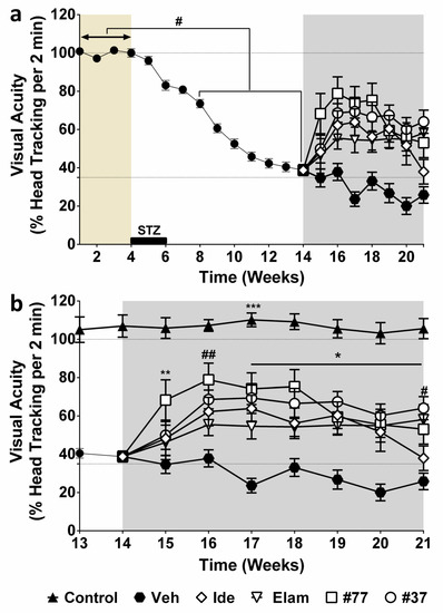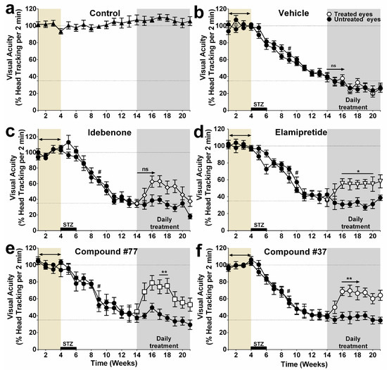 Subsequently, the data for the individual treatment groups were pooled and compared against the vehicle-treated group (Figure 2). In this analysis, all test compounds significantly improved vision, while the visual acuity of the vehicle-treated group (closed hexagon) did not improve (Figure 2b). This improvement was preserved for all test compounds over the observation period, except for idebenone (open diamonds) as compared with #37-treated animals (open circle), in which visual acuity significant declined in Week 21 (# p < 0.05) (Figure 2b). Compounds #37 and #77 dramatically improved vision within 2 weeks. Compound #77 (open squares) induced the fastest and highest recovery of head-tracking movements (** p < 0.01), restoring visual acuity from a residual ~35% in Week 14 to ~80% in Week 16. Although the #37-treated group appeared to show less vision recovery at Week 16 (up to ~65% of normal), there was no statistical difference between the #37- and #77-treated groups over the observation period. Despite being the least hyperglycemic group (Supplementary Materials, Figure S1), elamipretide-treated animals (open triangles) experienced the lowest recovery of visual acuity (both in extend and speed), where visual acuity was only restored to ~58% within 3 weeks of treatment. Although topical application of all test compounds restored visual function, it did not affect other parameters such as blood glucose levels, water intake, or body weight (other surrogate markers of diabetes) (grey areas in Supplementary Materials, Figure S1).