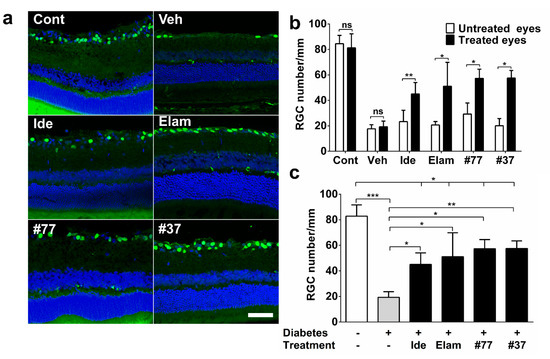 Effect of test compounds on retinal ganglion cell (RGC) numbers. (a) Representative images of Brn3a-stained retinal cryosections from nondiabetic control animals (Cont), as well as 5 treatment groups. Vehicle (Veh), idebenone (Ide), elamipretide (Elam), #77, #37 are shown. Scale bar = 100 µm. Images acquired at 20× magnification. Brn3a (green) and DAPI (blue); (b) Analysis of average numbers of RGC/mm of treated eye against untreated eye (intra-animal control) using ImageJ software. the Mann–Whitney test was used to compare treated eyes against untreated eyes for all treated groups; (c) Comparison of treatment groups against vehicle-treated (Veh) and nondiabetic group. The data represent mean for each treatment group (n = 6–12 eyes/group (3 independent samples), see Supplementary Materials, Table S2 for detail). Cont, nondiabetic control; Veh, vehicle; Ide, idebenone; Elam, elamipretide; ns, not significant. Significance was determined using the Kruskal–Wallis test. Error bar = SD. * p < 0.05, ** p < 0.01, *** p < 0.001.