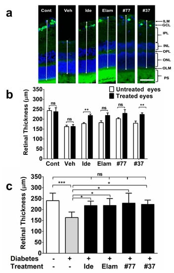 Effect of test compounds on retinal thickness. (a) Representative images of retinal cryosections from nondiabetic control animals, as well as 5 treatment groups. Scale bar = 100 µm. Images were acquired at 20× magnification. Brn3a (green) and DAPI (blue). Arrows exemplify measured retinal thickness between inner limiting membrane (ILM) to outer limiting membrane (OLM); (b) Quantification of retinal thickness by intra-animal comparison between treated and untreated eyes using ImageJ software. The data represent mean for each treatment group (n = 6–12 eyes/group (3 independent samples), see Supplementary Materials, Table S2 for detail). Significance was calculated using the Mann–Whitney test to compare treated (right) against untreated eyes (left); (c) Comparison of retinal thickness for all treatment groups against vehicle treated, as well as nondiabetic control. The data represent mean for each treatment group (n = 6–12 eyes/group, see Supplementary Materials, Table S2 for detail). Cont, nondiabetic control; Veh, vehicle; Ide, idebenone; Elam, elamipretide; ns, not significant. Significance was calculated using the Kruskal–Wallis test. Error bars = SD. * p < 0.05 ** p < 0.01, *** p < 0.001.