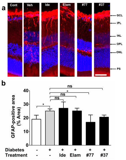 In healthy, nondiabetic control retinas, glial fibrillary acidic protein (GFAP) reactivity was restricted to astrocyte and Muller cells in the retinal ganglion cell (RGC) layer (Figure 5a). In contrast, in diabetic rats, activated Muller cell projections extended from the inner plexiform layer (IPL) to the inner nuclear layer (INL) (Figure 5a). A significant increase in GFAP expression was detected in diabetic as compared with nondiabetic control animals (Figure 5b) (p < 0.05). After 7 weeks of treatment, only #77 had significantly reduced GFAP immunoreactivity (p = 0.0169), with no significant difference between the nondiabetic control and the #77-treated group (Figure 5b, significance is not shown in graph for clarity).