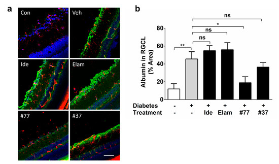 Albumin immunoreactivity in the RGC layer was significantly increased in vehicle-treated diabetic as compared with healthy nondiabetic rats (p < 0.01) (Figure 6a,b). Albumin immunoreactivity was predominantly observed in the RGC layer; a weak signal was observed in the inner plexiform layer (IPL) and inner nuclear layer (INL), and, to a lesser degree, in the outer plexiform layer (OPL) and outer nuclear layer (ONL) (Figure 6a). Treatment with idebenone, elamipretide, and #37 did not show any significant effects as compared with the untreated diabetic group (p > 0.05). In contrast, #77 treatment significantly reduced albumin reactivity as compared with the untreated diabetic group (p < 0.05) (Figure 6b), while no significant difference was observed between the healthy control and the #77-treated groups.