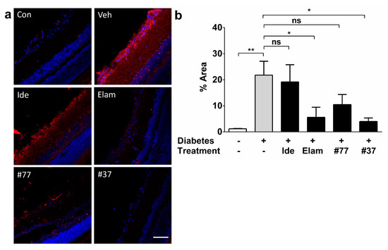 Effect of test compounds on retinal vascular leakage. (a) Representative images of retinal cryosections from nondiabetic control animals, as well as 5 treatment groups. Scale bar = 100 µm. Images were acquired at 20× magnification. Albumin (green), tomato lectin (red), and DAPI (blue); (b) Quantification of test compound effects on vascular leakage. The data represent average albumin-positive areas of all treatment groups against the vehicle-treated as well as the nondiabetic (control) group. The data represent mean with n = 5 eyes/group (3 independent samples). Error bars = SD. * p < 0.05, ** p < 0.01 (significance calculated using the Kruskal–Wallis test). Cont, nondiabetic control; Veh, vehicle; Ide, idebenone; Elam, elamipretide, ns, not significant. Significance labels of test compound groups against the nondiabetic control group are omitted for clarity.