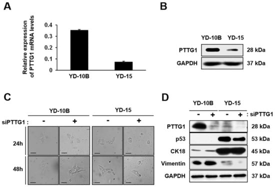 First, we confirmed the expression of PTTG1 in both oral SCC cell lines YD-10B and YD-15 by qRT-PCR and Western blotting. The expression of PTTG1 mRNA and protein was increased more in the YD-10B cells than in the YD-15 cells (Figure 1A,B). Generally, PTTG1 is involved in oncogenesis []. To confirm the effect of PTTG1 on the oral SCC cell lines, we confirmed the viability of the oral SCC cell lines regardless of the PTTG1 expression using PTTG1-specific siRNA treatment (siPTTG1) (Figure 1C). As shown in Figure 1D, the expression of PTTG1 in the YD-10B and YD-15 cell lines was dramatically decreased after siPTTG1 treatment. No expression of p53 was detected in the YD-10B cell line because they have a mutant type of p53, whereas p53 was highly expressed in the YD-15 cells, which have wild-type p53 (Figure 1D). Also, the expression of p53 was decreased in the YD-15 cells by siPTTG1 treatment, but there was no difference in the expression of CK18 between the two cell types (Figure 1D). Furthermore, we confirmed the expression of vimentin because it is overexpressed in most epithelial cancer and correlates with tumor growth and poor prognosis []. The expression of vimentin was increased in the YD-10B cells, whereas vimentin expression was decreased in the YD-15 cells compared to the mock control (Figure 1D). However, the morphological characteristics of both cell types were not changed by siPTTG1 treatment. These findings suggest that the expression of PTTG1 affected oncogenesis in the YD-10B and YD-15 cells.