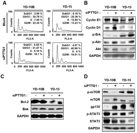 Generally, PTTG1 controls cell proliferation by regulating chromatid separation during cell mitosis []. Thus, we confirmed the effect of PTTG1 on the proliferation of YD-10B and YD-15 cells by Western blotting and FACS analysis following siPTTG1 treatment. We determined the proportion of cells in S phase in the YD-10B (7.55%) and YD-15 (12.85%) cell lines compared to the mock control group. After siPTTG1 treatment, the proportion of YD-10B cell in S phase was increased (9.18%), whereas it was decreased in YD-15 cells (4%) (Figure 2A). The activation of cyclin D1 is mainly responsible for regulating the G1-S phase transition and useful as prognostic biomarkers in oral SCC [,]. These results are consistent with the marked increase in the expression of cyclin D1 protein in YD-10B cells transfected with siPTTG1 compared to the control. In contrast to YD-10B, the expression of cyclin D1 was remarkably decreased in YD-15 cells transfected with siPTTG1 compared to the control (Figure 2B). To analyze cellular proliferation and death, the expression of phosphorylated Akt (p-Akt), which used as a marker for cell proliferation, was increased in both cell lines by treatment with siPTTG1 compared to the control, although no significant difference was detected in cyclin E1, phosphorylated Erk (p-Erk), Bcl-2 or Bak (Figure 2B,C). Interestingly, the expression of phosphorylated mTOR, which used as a marker for autophagy, in the YD-10B cell line was dramatically decreased, but increased in the YD-15 cells, after siPTTG1 treatment. Additionally, the expression of gp130 was increased in the YD-10B cells after siPTTG1 treatment, but decreased in the YD-15 cells, although the expression of STAT3 and phosphorylated STAT3 was decreased (Figure 2D). These results indicate that the knockdown of PTTG1 decreased the proliferation of YD-10B cells and increased YD-15 cell proliferation by upregulating or downregulating the cell cycle, respectively, in a p53 expression-dependent manner.