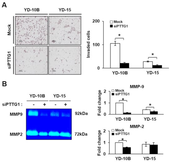 Since several groups reported that PTTG1 promoted the invasion ability in different types of cancer cells [,], we investigated whether PTTG1 regulated the invasion ability of YD-10B and YD-15 cells using a Transwell chamber assay. The number of invaded YD-10B cells treated with siPTTG1 were significantly decreased compared to the mock control (p < 0.05, Figure 3A). Although the invasion ability of the YD-15 cells was lower than that of the YD-10B cells, the number of invaded cells was significantly decreased after siPTTG1 treatment compared to the mock control (p < 0.05, Figure 3A). Furthermore, the expression of MMP-2 and MMP-9 released from the YD-10B cells treated with siPTTG1 was markedly decreased compared to the mock control (p < 0.05, Figure 3B). In the YD-15B cells, the expression of MMP-9 was significantly decreased but there was no difference in MMP-2 expression following siPTTG1 treatment (p < 0.05, Figure 3B). These results suggest that the downregulation of PTTG1 by siPTTG1 treatment suppressed the invasion ability of the YD-10B and YD-15 cells by decreasing the expression of MMPs.