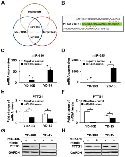 Effect of up-regulated of miR-186 and -655 on PTTG1 expression in oral SCC celllines. (A) Venn diagram showing overlapping miRNAs related to PTTG1 mRNA by Microcosm, Micro RNA, and Target Scan. (B) miRNA sequence and target of the PTTG1 gene in the 3′-UTR site. Expression of (C) miR-186 and (D) miR-655 determined by qRT-PCR in YD-10B and YD-15 cells treated with mimic sequences. mRNA expression of PTTG1 determined by qRT-PCR in YD-10B and YD-15 cells treated with (E) miR-186 and (F) miR-655 mimic sequence. * indicates significant differences between Negative control and mimic treatment (p < 0.05). All experiments were performed in triplicate. Protein expression of PTTG1 determined by Western blots in YD-10B and YD-15 cells treated with (G) miR-186 and (H) miR-655 mimic sequence. GAPDH was used as an internal control.