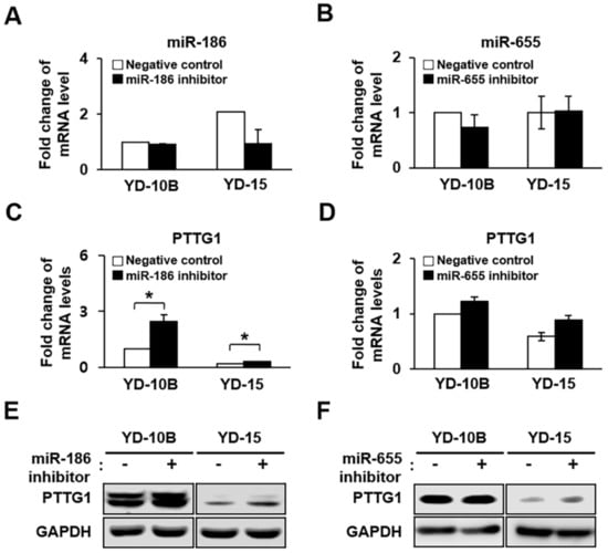 To associate miRNAs with the regulation of PTTG1 expression, a bioinformatics search was performed in three databases, Microcosm, MicroRNA, and TargetScan, for predicted miRNA-targeting PTTG1 mRNAs. The databases predicted miR-186 and miR-655 as potential miRNAs targeting PTTG1 (Figure 4A). Furthermore, these tools indicated that the mRNA 3′ UTR of PTTG1 matched with miR-186 and miR-655 (Figure 4B). Synthesized miRNA mimics, inhibitor or scrambled control were transfected into the YD-10B and YD-15 cells. In the qRT-PCR analysis, the expression of miR-186 and miR-655 were effectively decreased in YD-10B and YD-15 cells treated with the mimic sequence (p < 0.05, Figure 4C,D, respectively), resulting in significantly decreased mRNA and protein expression of PTTG1 compared to the control (p < 0.05, miR-186, Figure 4E,G; miR-655, Figure 4F,H). In contrast, YD-10B and YD-15 cells treated with the miR-186 inhibitor sequence showed decreased expression levels, although the decreases were not statically significant (Figure 5A), resulting in increased mRNA and protein expression of PTTG1 compared to the control (p < 0.05, Figure 5C,E). As shown in Figure 6B, the expression level of miR-655 decreased in cells treated with the miR-655 inhibitor sequence, resulting in an increased mRNA and protein expression of PTTG1 (Figure 5D,F). However, the miR-655 inhibitor had no impact on PTTG1 protein levels (Figure 5F). These results suggest that the expression of PTTG1 was modulated by miR-186 and miR-655 in the YD-10B and YD-15 cells.