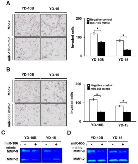 Effect of upregulated miR-186 and -655 on invasion abilities of oral SCCcell lines. Image (left) and numbers (right) of invaded YD-10B and YD-15 cells treated with (A) miR-186 and (B) miR-655 mimic sequences. Magnification, ×100; scale bar = 100 μm. The values are means ± standard errors.* indicates significant differences between negative control and mimic treatment (p < 0.05). All experiments were performed in triplicate. Activity of MMP-9 and -2 analyzed by zymography in YD-10B and YD-15 cells treated with (C) miR-186 and (D) miR-655 mimic sequences.