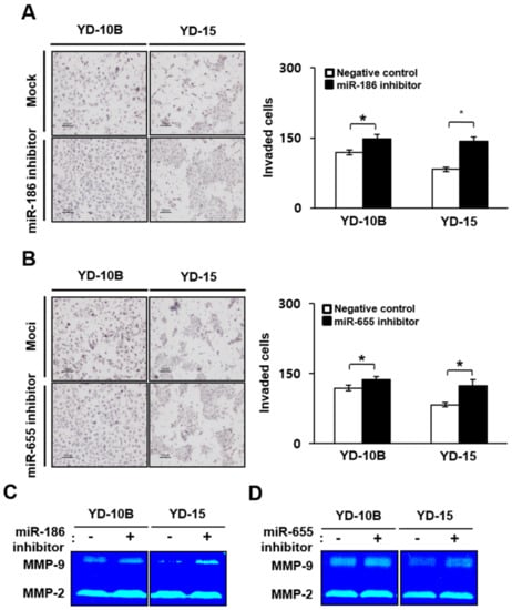 In contrast to the mimic sequence results, the number of invaded YD-10B and YD-15 cells treated with the miR-186 or miR-655 inhibitor sequences was higher than that of the control cells. The number of invaded YD-10B and YD-15 cells treated with the miR-186 inhibitor sequence was 1.3 or 1.6 times higher, respectively, than that of the control cells (p < 0.05, Figure 7A). In addition, the number of invaded YD-10B and YD-15 cells treated with the miR-655 inhibitor sequence was 1.2 times higher than the control cells (p < 0.05, Figure 7B). Furthermore, the activities of MMP-9 were increased in YD-10B and YD-15B cells treated with the inhibitor sequence, regardless of the miRNAs, compared to control cells. However, the MMP-2 activities were not significantly different, regardless of the miRNA treatment (Figure 7C,D). These results strongly suggest that miR-186 and miR-655 were capable of directly targeting the 3′-UTRs of the PTTG1 genes, resulting in the alteration of PTTG1 expression associated with the invasion ability of oral SCC cells via MMP-9 activity.