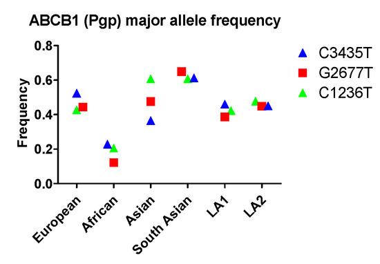 The allele frequency of ABCB1 in different populations. Asian: All Asian individuals excluding South Asians; LA1, Latin American individuals with Afro-Caribbean ancestry; LA2: Latin American individuals with mostly European and Native American Ancestry. Data were extracted from NCBI (National Center for Biotechnology Information) ALFA project (version: 20200227123210, www.ncbi.nlm.nih.gov/snp/docs/gsr/alfa/ [17]).