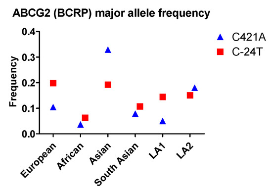 The allele frequency of ABCG2 in different populations. Asian: All Asian individuals excluding South Asians; LA1: Latin American individuals with Afro-Caribbean ancestry; LA2: Latin American individuals with mostly European and Native American Ancestry. Data were extracted from NCBI ALFA project (version: 20200227123210, www.ncbi.nlm.nih.gov/snp/docs/gsr/alfa/ [17]).