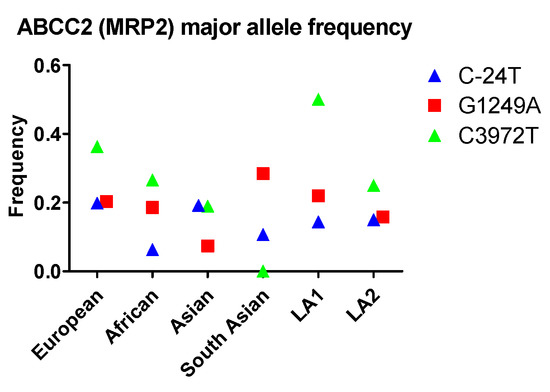 The allele frequency of ABCC2 in different populations. Asian: All Asian individuals excluding South Asians; LA1: Latin American individuals with Afro-Caribbean ancestry; LA2: Latin American individuals with mostly European and Native American Ancestry. Data were extracted from NCBI ALFA project (version: 20200227123210, www.ncbi.nlm.nih.gov/snp/docs/gsr/alfa/ [17]).