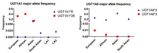 Genetic studies have shown that UGT genes are polymorphic, and more than 200 UGT alleles have been identified in humans [86]. The most prevalent alleles of UGT isoforms in different races have been reported or reviewed previously [87,88,89]. As most previous reviews focused on UGT isoforms expressed in the liver, we will review the racial disparity of UGT1A1 and 1A8 SNPs, two major UGT isoforms highly expressed in the GI tract. UGT1A1 has at least 33 SNPs, among which UGT1A1*6 (211G>A) and *28 ((TA)7TAA) are well studied, probably because these two SNPs are closely associated with drug disposition and response. For UGT1A8, *2 and *3 are major SNPs that are well studied.