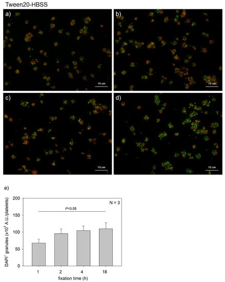 For fixation, our results indicated that 10% formalin was most suitable for stabilizing platelets and that polyP was better retained on the specimen, as the fixation time was prolonged. Therefore, the platelets were fixed in 10% formalin for at least 4 h at room temperature. For membrane permeabilization, our results indicated that Triton X-100 at the concentration used (0.1%) may be too strong for surfactant action to retain some important compounds involved in DAPI visualization. When treatment was limited to 30 min, saponin (0.02%) was slightly more effective than Tween-20 (0.1%) in HBSS. PBS was not acceptable because of its low reproducibility.