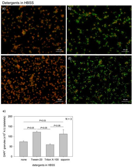 Effects of detergent types on polyphosphate detection in platelets. Platelets immobilized on glass slides using a Cytospin were fixed in 10% neutral-buffered formalin for 4 h, then treated with 4′,6-diamidino-2-phenylindole (green) and phalloidin (red) in (a) detergent-free Hanks balanced salt solution (HBSS), (b) 0.1% Tween-20-containing HBSS, (c) 0.1% Triton-X-100-containing HBSS, or (d) 0.02% saponin-containing HBSS and examined using a fluorescence microscope. (e) Quantification of DAPI staining in the fluorescence images (above). A significant difference was obtained via a parametric test but not by using a non-parametric test.