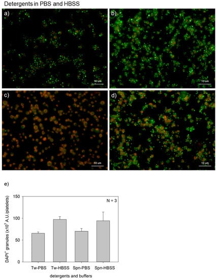 Effects of buffer types on polyphosphate detection in platelets. Platelets were suspended in phosphate-buffered saline (PBS) and incubated for 60 min at room temperature (22–25 °C). Platelets were then immobilized on glass slides using a Cytospin, fixed in 10% neutral-buffered formalin for 4 h, and then treated with 4′,6-diamidino-2-phenylindole (green) and phalloidin (red) in (a) 0.1% Tween-20-containing PBS, (b) 0.1% Tween-20-containing Hanks balanced salt solution (HBSS), (c) 0.02% saponin-containing PBS, or (d) 0.02% saponin-containing HBSS and examined using a fluorescence microscope. (e) Quantification of DAPI staining in the fluorescence images (above). No significant differences were observed.