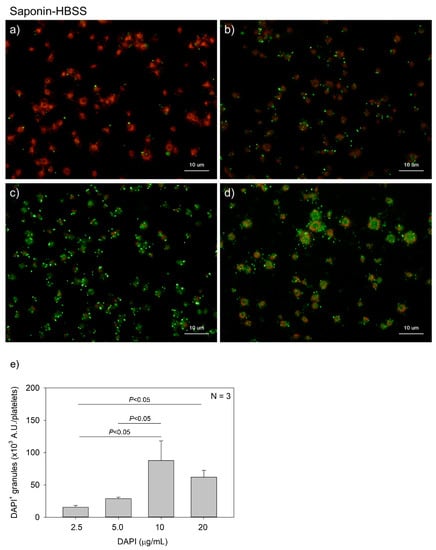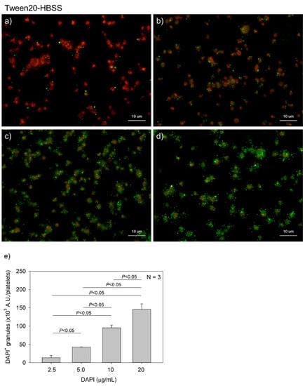 Figure 4 and Figure 5 show the effects of DAPI concentrations on polyP detection in platelets. Compared to DNA staining, PolyP staining may require higher concentrations of DAPI. However, to minimize unidentified non-specific binding and reduce the expense of unnecessary dye without sacrificing data reliability, we optimized the concentration of DAPI. DAPI at 2.5, 5.0, 10, and 20 μg/mL (green) was examined in both 0.1% Tween-20-containing HBSS (Tw-HBSS) (Figure 4) and 0.02% saponin-containing HBSS (Spn-HBSS) (Figure 5). A parametric test revealed that in Figure 4, DAPI dose-dependently increased the values and that the rate of increase was suppressed between 10 and 20 μg/mL, and that in Figure 5, the values reached the plateau at 10 μg/mL DAPI. Thus, maximal staining was commonly observed at 20 and 10 μg/mL DAPI in Tween-20 and saponin, respectively. Therefore, to reduce possible non-specific binding, we used 10 μg/mL DAPI in all the subsequent experiments.