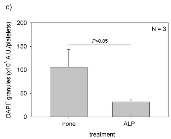 Figure 9 shows the effects of ALP on the detection of polyP in platelets. After 4 h of fixation with 10% neutral-buffered formalin, control platelets were treated with 0.04 U/μL ALP in Mg2+-containing alkaline buffer for 24 h and then stained with DAPI in Tw-HBSS. As expected, ALP treatment almost completely eliminated granular and diffused polyP. Both parametric and non-parametric tests revealed that ALP treatment significantly reduced the value.