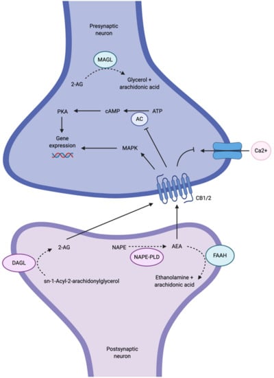 Although AEA and 2-AG are ligands for both CB1 and CB2 receptors, CB1 receptors are primarily targeted by AEA as well as Δ9-tetrahydrocannabinol (Δ9-THC), the psychoactive ingredient in marijuana [5,12]. Conversely, CB2 receptors are primarily targeted by 2-AG. Both CB1 and CB2 receptors are coupled to Gi/o proteins that, when stimulated, inhibit adenylyl cyclase (AC) activity, subsequently inhibiting cyclic AMP (cAMP) and the protein kinase A (PKA) phosphorylation pathways, or activating mitogen-activated protein kinase (MAPK) (Figure 1) [10]. Both events have the ability to regulate gene expression [10]. The activation of Gi/o proteins also reduces internal calcium currents; they are thus capable of regulating neurotransmitter release [4]. The net effect of ECS activity on synaptic transmission is dependent on whether CB1 receptors are found on GABAergic (inhibitory) or glutamatergic (excitatory) terminals [4]. To terminate endocannabinoid signaling, AEA is metabolized by fatty acid amide hydrolase (FAAH) in the postsynaptic neuron, and 2-AG is metabolized by monoacylglycerol lipase (MAGL) in the presynaptic neuron [7].