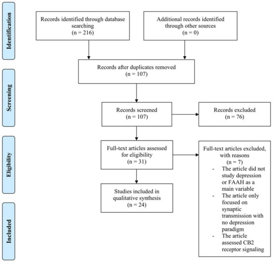 A comprehensive search of the literature using PubMed, Scopus and Embase databases was performed (all hits until October 2020) according to the PRISMA statement [96]. The search terms consisted of “fatty acid amide hydrolase or FAAH and depressi*”.