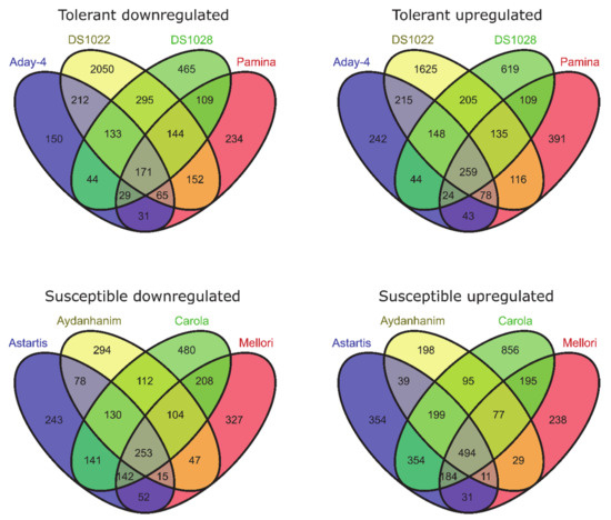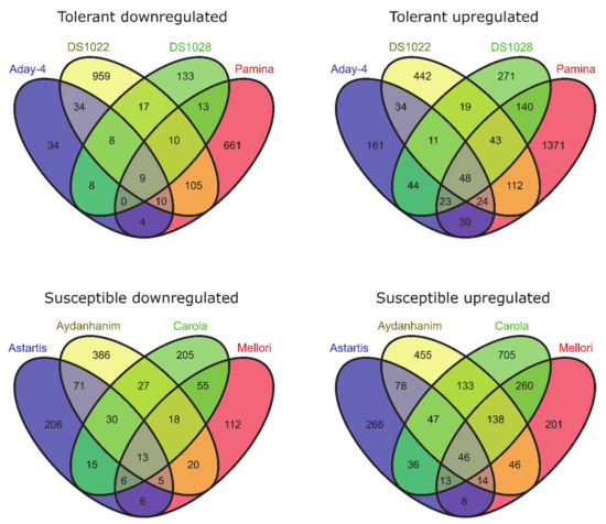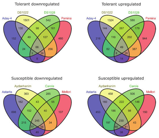 From the differential gene expression analysis followed by comparisons using Venn diagrams, many differentially expressed genes (DEGs) were detected in various comparisons. It is emphasized that the following numbers are based on DEGs common to four accessions from each group of de-acclimation-tolerant and -susceptible genotypes.