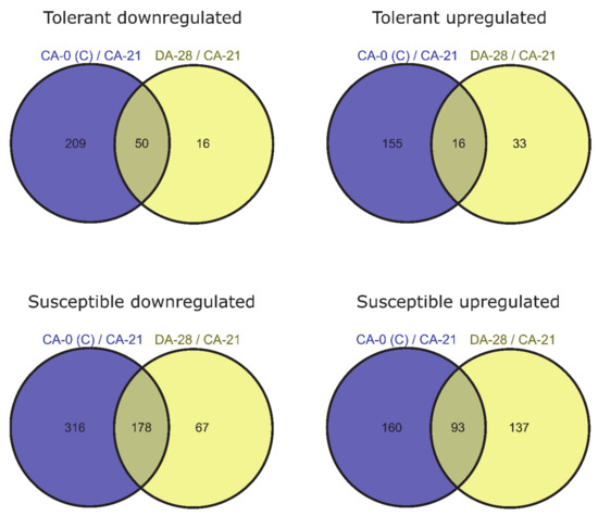 When compared between DA-28 and CA-0 (C) for tolerant barley accessions, 118 genes were differentially expressed (97 upregulated and 21 downregulated) at FDR < 0.05 and 57 (48 upregulated and 9 downregulated) at FDR < 0.01 (Figure 3). With respect to susceptible accessions, the same comparison identified 125 DEGs (95 upregulated and 30 downregulated) at FDR < 0.05, of which 59 (46 upregulated and 13 downregulated) were significant at FDR < 0.01 (Figure 3).