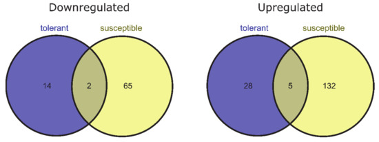 To identify genes for which expression changed owing to de-acclimation only (different from DEGs also associated with cold acclimation but regulated in the opposite direction during de-acclimation), we compared common DEGs for CA-0 (C) vs. CA-21 and DA-28 vs. CA-21. Ninety-nine DEGs (25 downregulated and 74 upregulated) were specific only to conditions mimicking de-acclimation during mid-winter warm spell in de-acclimation-tolerant barley accessions (FDR < 0.05), of which 49 genes (33 up- and 16 downregulated) were significant at FDR < 0.01 (Figure 4). In addition, 343 genes (121 downregulated and 222 upregulated) were differentially expressed explicitly after de-acclimation in susceptible barley accessions (FDR < 0.05), of which 204 genes (137 upregulated and 67 downregulated) were significant at FDR < 0.01 (Figure 4). Only 54 DEGs (19 upregulated and 35 downregulated, FDR < 0.05) specific only to de-acclimation during mid-winter warm periods were common to both de-acclimation-tolerant and -susceptible barley accessions, of which seven genes (five upregulated and two downregulated) were significant at FDR < 0.01 (Figure 5).