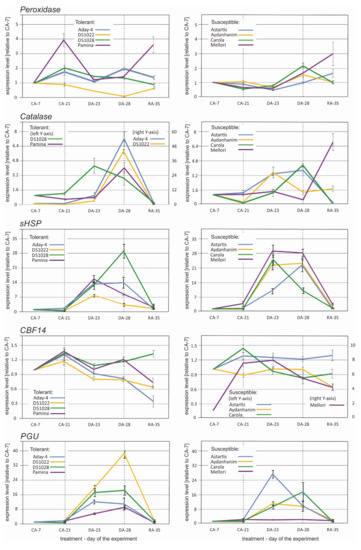 Expression profiles of peroxidase, catalase, sHSP, CBF14, and PGU inhibitor-like genes during acclimation to cold (CA-7), after 3-week cold acclimation (CA-21), during de-acclimation (DA-23), after 7-day de-acclimation (DA-28), and during re-acclimation to cold (RA-35) in tolerant (left) and susceptible (right) to de-acclimation barley accessions. The de-acclimation period is indicated between the vertical dashed lines.
