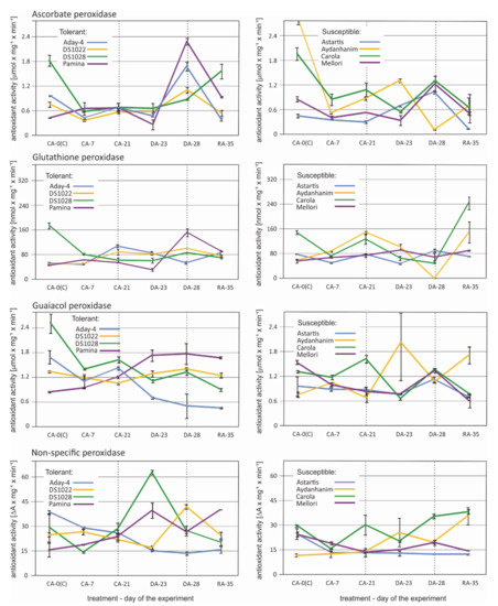 Changes in antioxidant activity of peroxidases: Ascorbate, glutathione, guaiacol, and nonspecific peroxidase in six time points—before cold acclimation (CA-0 (C)), during acclimation to cold (CA-7), after 3-week cold acclimation (CA-21), during de-acclimation (DA-23), after 7-day de-acclimation (DA-28), and during re-acclimation to cold (RA-35) in tolerant (left) and susceptible (right) to de-acclimation barley accessions. The de-acclimation period is indicated between the vertical dashed lines.